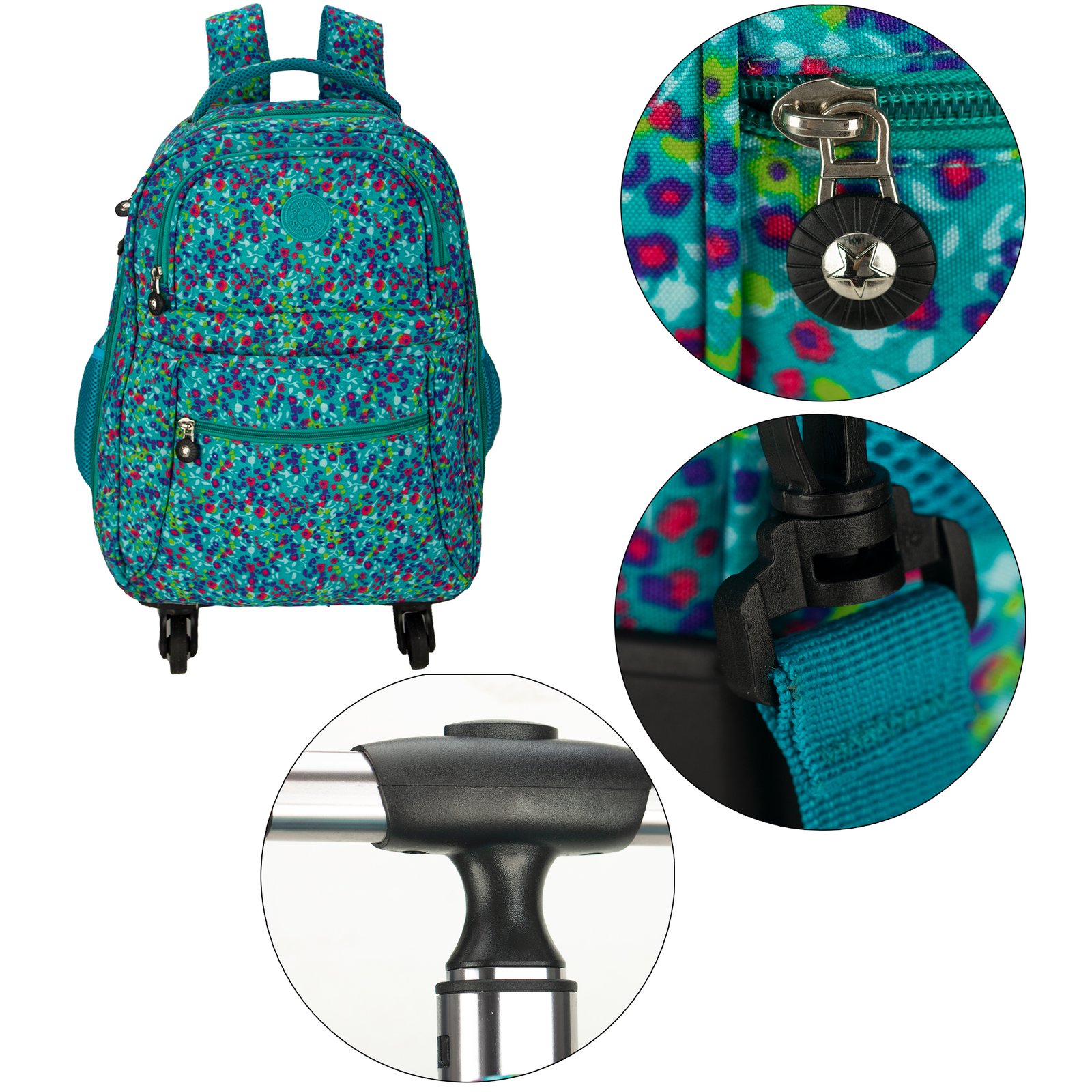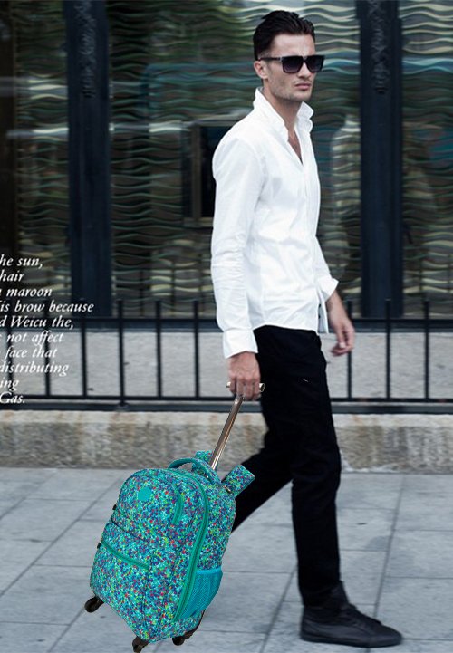 - Trolley backpack: the bag features a retractable handle, adjustable shoulder straps, a top handle and wheels for movement